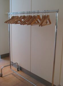 Verchromter Garderobenständer inklusive 40 Holzbügel.
